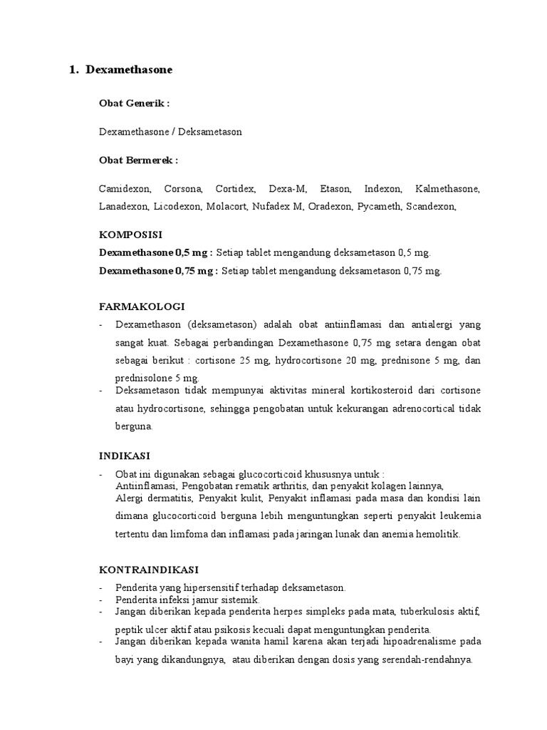 Obat ini 20 30 kali lebih kuat daripada hydrocortisone dan 5 7 kali lebih kuat daripada prednisonobat dexamethasone bekerja dengan cara menembus membran sel sehingga akan terbentuk suatu kompleks steroid protein reseptor. Sebagai perbandingan dexamethasone 075 mg setara dengan obat sbb. Cari tahu fungsi dosis indikasi efek samping dan keamanan obat ini di hello sehat.