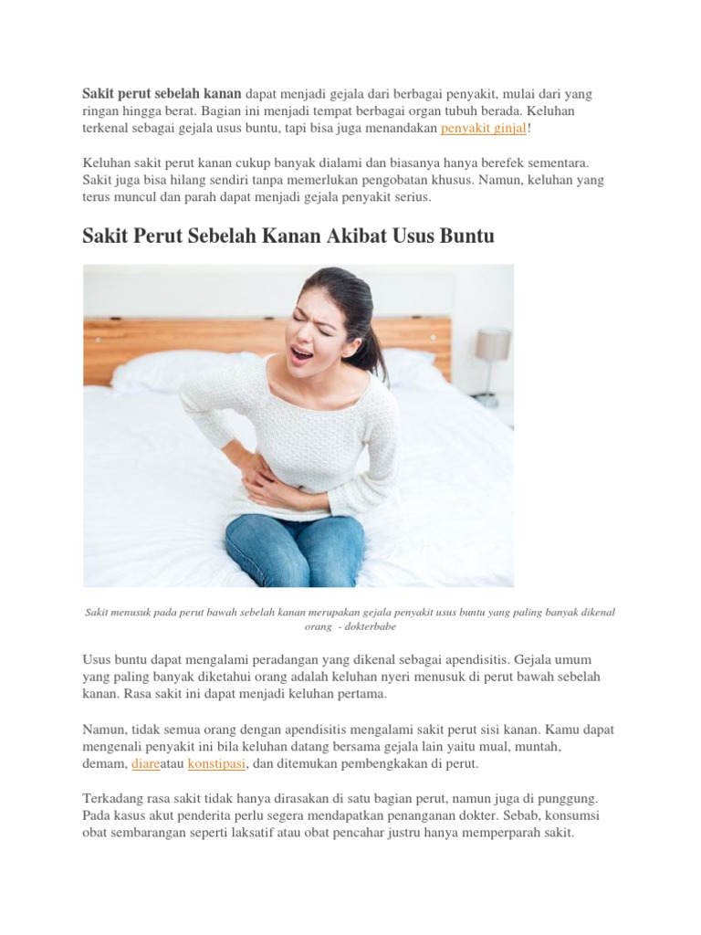 Sakit perut di sebelah kanan. Ada berbagai penyebab penyakit dari kondisi sakitnya perut di sebelah kanan bawah dan segala kemungkinan penyakit ada yang cukup ringan tapi juga ada yang serius. Selain sakit pada perut sebelah kiri bawah kamu juga dapat merasakan ketidaknyamanan dan berat di bagian perut. Untuk sakit perut sebelah kanan bagian bawah dapat disebabkan.