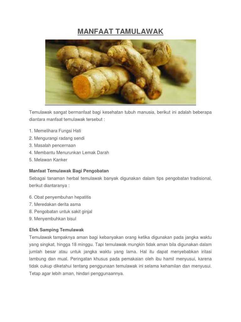 Efek samping lain yang relatif tidak berbahaya dari temulawak adalah sebagai penambah nafsu makan. Efek samping temulawak terhadap ginjal juga harus diperhatikan dengan seksama. 35 manfaat temulawak untuk ginjal dan cara mengkonsumsinya sudah banyak yang mencoba dan dengan cara alami dijamin tidak ada efek samping tanpa cuci darah.