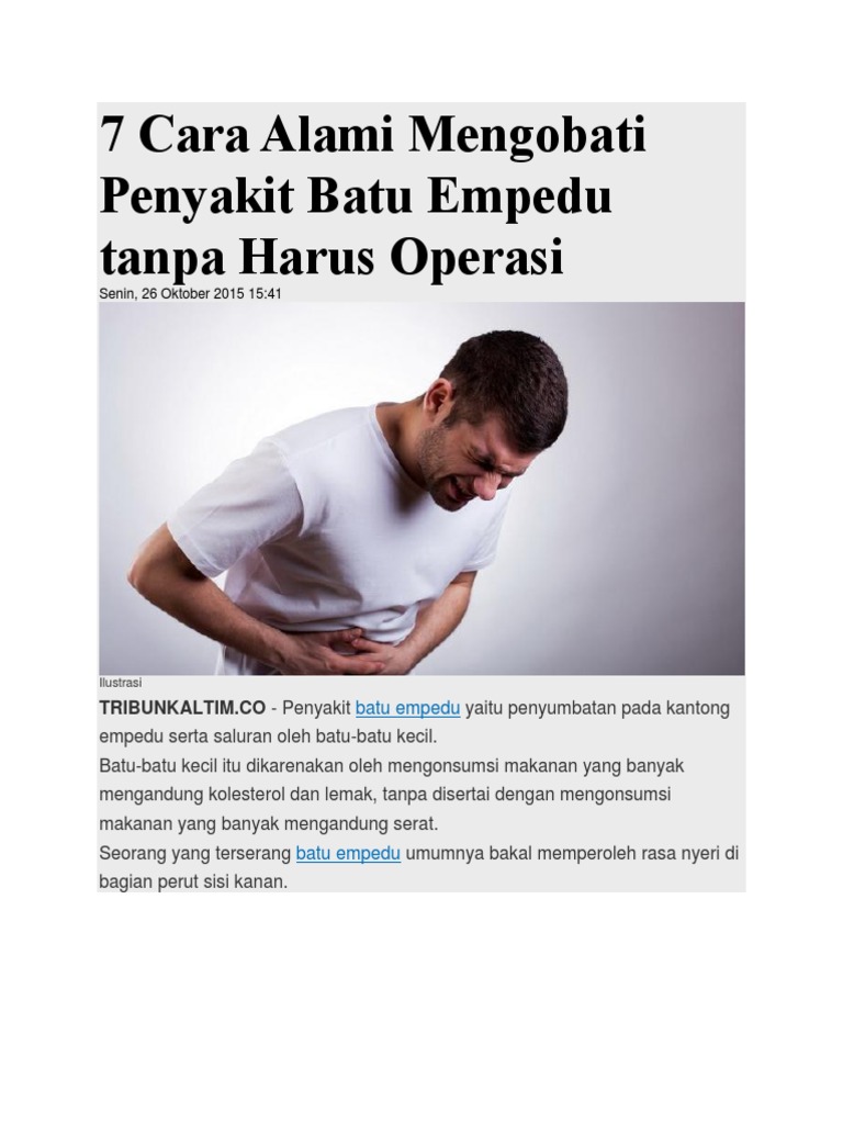 Cara ampuh menghancurkan batu empedu tanpa operasi. 7 cara alami mengobati penyakit batu empedu tanpa harus operasi menyembuhkanempedu serbatahu sehat seseorang yang menanggung derita batu empedu bila dibawa ke dokter umumnya bakal dilakukan. Batu empedu dapat juga berasal dari penyerapan kolesterol oleh cairan empedu yang tidak sempurna.