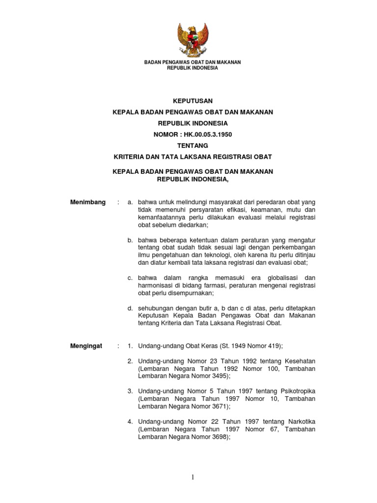 Badan pengawas obat dan makanan republik indonesia peraturan kepala badan pengawas obat dan makanan republik indonesia nomor. Kriteria dan persyaratan obat yang didaftarkan di indonesia informasi. Bahwa kriteria dan tata laksana registrasi produk biologi sejenis atau produk biosimilar telah ditetapkan dalam peraturan kepala badan pengawas obat dan makanan nomor hk03123101108481 tahun 2011 tentang kriteria dan tata laksana registrasi obat sebagaimana.
