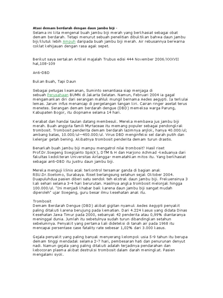 Dimusim hujan hampir tidak ada daerah di indonesia yang terbebas dari serangan penyakit dbd. Jambu biji merah merupakan salah satu buah yang baik untuk penderita demam berdarah manfaat buah ini akan lebih optimal diserap tubuh jika diolah sebagai minuman jus. Jus buah ini dianggap dapat mengobati penyakityang disebarkan oleh nyamuk aedes aegyptiitu.