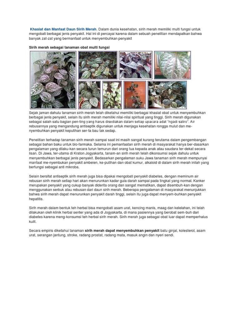 Untuk membantu dengan tekanan darah tinggi anda bisa mencoba rebus 3 4 lebar daun sirih merah dan minum air rebusan daun sirih tersebut untuk dua kali sehari. Selain kencing manis masyarakat disana menggunakan sirih merah sebagai obat tradisional untuk mengatasi penyakit seperti kanker asam urat hepatitis kelelahan dan maag peradangan hipertensi darah tinggi dan ambien. Kanker serviks dan kanker payudara merupakan penyakit yang mengerikan dan mematikan sehingga menjadi musuh bagi setiap wanita di dunia mengingat kanker ini merupakan jenis kanker yang menyerang kaum wanita.