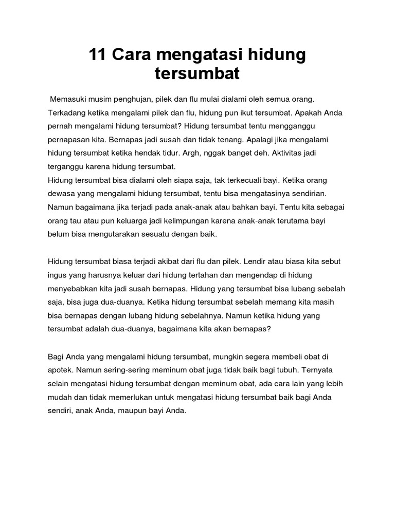 Cara menghilangkan pilek dan hidung tersumbat. Menghilangkan hidung tersumbat dengan jalan jalan 12 cara ampuh mengatasi hidung tersumbat menjelang tidur di malam hari jika anda terganggu oleh hidung tersumbat di malam hari dan saat itu tidak merasa lemah atau lelah maka anda dapat pergi keluar untuk berjalan jalan dan refreshing sejenak. Bernapas di udara yang lembap bisa meredakan radang dan meredakan pembengkakan pembuluh darah dalam hidung juga mengencerkan lendir dalam sinus. Meskipun begitu hidung tersumbat akibat pilek dan alergi bisa berkembang menjadi masalah serius dengan cepat pada bayi.