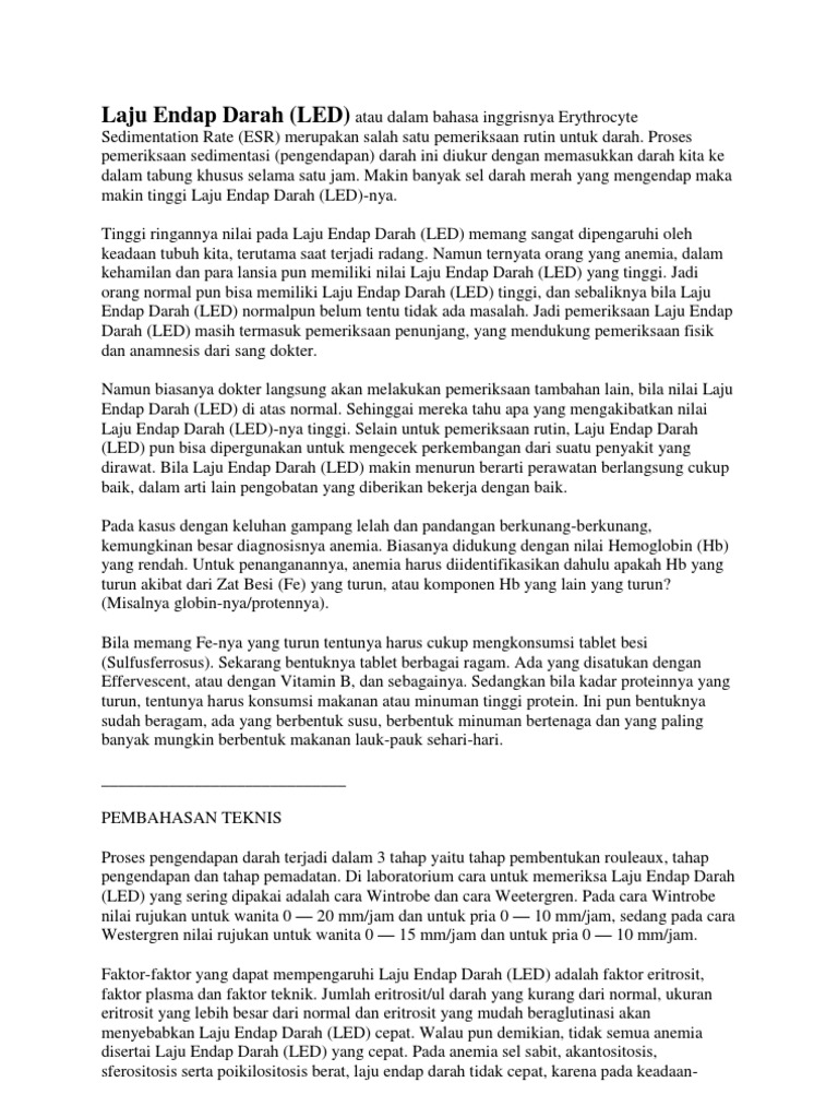 Laju endap darah led atau yang dalam bahasa inggris disebut dengan erythrocyte sedimentation rate esr adalah tes yang sering dilakukan tapi sangat tidak spesifik artinya memiliki led yang tinggi tidak selalu menunjukkan ada sesuatu yang salah hanya bahwa mungkin ada yang sedang tidak beres. Dear dokter saya ingin bertaanya dari hasil mcu saya tahun ini dan tahun lalu didapatkan laju endap darah saya tinggi dok yaitu 59 mmjam normal 0 15.