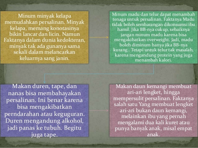 Minum minyak kelapa melancarkan persalinan. Salah satu resep trasional agar mudah melahirkan yang dipercaya beberapa orang adalah dengan mengonsumsi minyak kelapa. Kabar tersebut yaitu bahwa dengan mengonsumsi minyak zaitun maka akan melancarkan proses persalinan. Meningkatkan kualitas asi pada ibu.