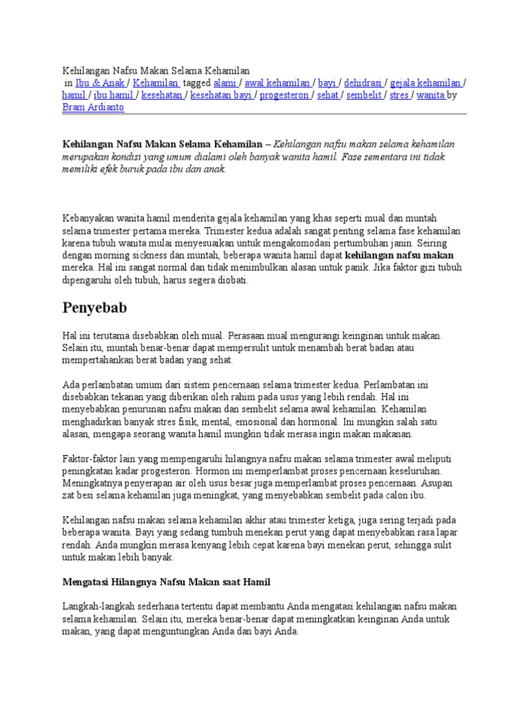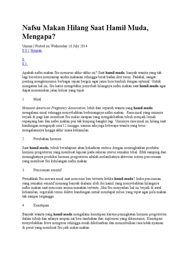 Tidak nafsu makan dan mual. Banyak calon ibu yang merasa tidak nafsu makan selama trimester pertama. Tidak nafsu makan sebaiknya tidak dianggap remeh. Entah itu karena masalah mual dan muntah saat hamil yang memang bikin nafsu makan menurun atau karena perubahan hormon dan mood selama kehamilantapi jangan anggap sepele masalah tidak nafsu makan saat hamil.