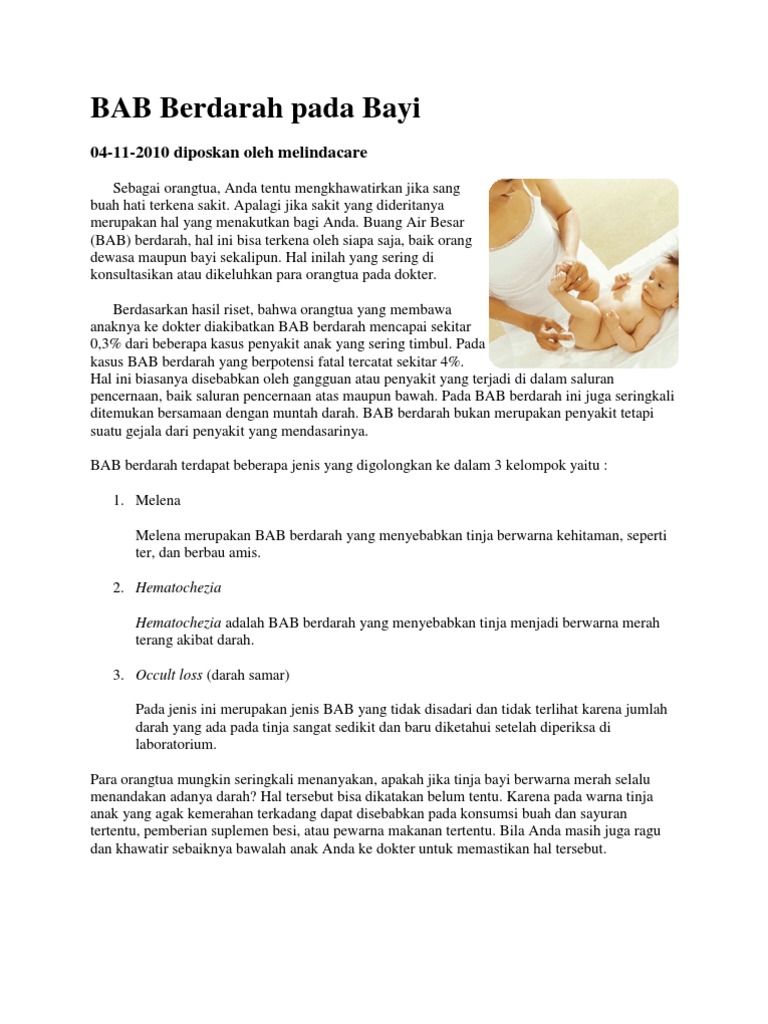 Beberapa penyebab bab bayi berdarah dan berlendir memang mudah diobati meskipun ada yang berpotensi mengancam jiwa. Nah jika bayi anda masih berumur belasan hari atau kurang dari 6 bulan maka yang konsumsi ini adalah ibunya si bayi. Bab anak ada lendir darah.