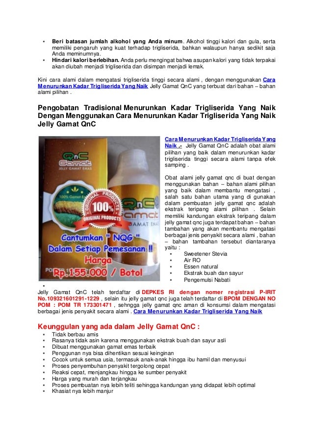 Hal ini karena qnc jelly gamat diproduksi dengan menggunakan teknologi yang masih berstandar tradisional untuk menjaga keutuhan kandungan alami di dalamnya melalui 4 tahapan. Apabila dokter telah memberi tahu bahwa anda memiliki kadar trigliserida yang tinggi anda bisa mengubah gaya hidup dan pola makan untuk menurunkan kadar trigliserida anda secara alami. Secara alami ada beberapa cara yang dapat anda lakukan.