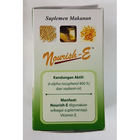 Nourish e 400 iu 30 kapsul lindungi diri dari efek aktifitas sehari hari aktifitas sehari hari dan lingkungan mempengaruhi kesehatan. Kembali lagi semua tergantung pada reaksi setiap tubuh penggunanya. Nourish e 400 iu kapsul mengandung vitamin e yang berfungsi untuk merawat kulit.