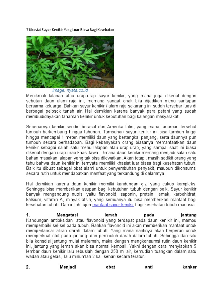 Tidak bisa kemo dan saya mencoba menjadi obat apa yang cocok untuk. Untuk menanggulangi penyakit kanker dapat mengkonsumsi rebusan daun kenikir sesering mungkin namun tetap mengkonsumsi manfaat air putih yang berfungsi untuk pelarut zat agar. Efek samping daun kenikir.