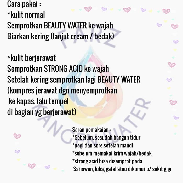 Beauty water dan strong acid untuk pemakaian luar tidak untuk di minum. Harga paket beauty water dan strong acid water. Semprotkan kangen beauty water keseluruh permukaan wajah secara merata.
