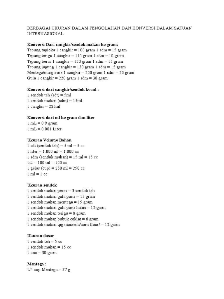 Takaran Memasak Konversi Ukuran Cc Milliliter Ml Sendok