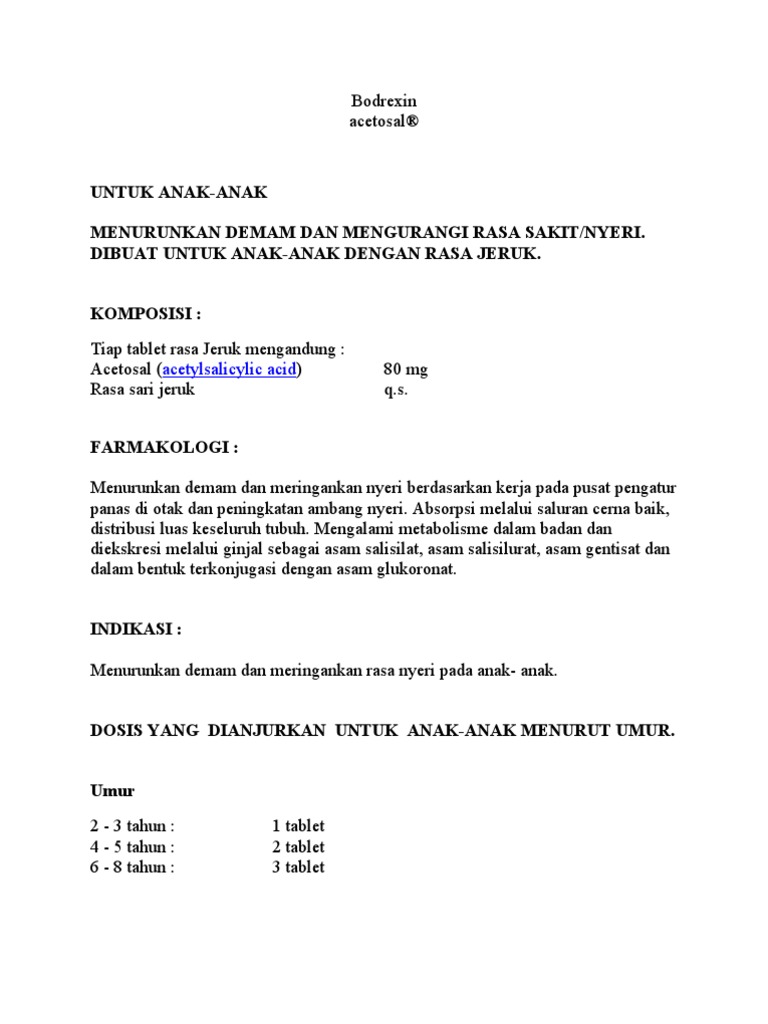 Misalnya saja ada program preschool untuk anak 1 tahun. Bodrexin acetosal menurunkan demam dan mengurangi rasa sakitnyeri. Bodrexin acetosal diberikan dengan dosis berikut.