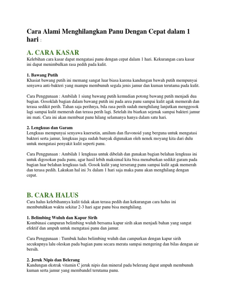 Cara menghilangkan panu dengan bahan alami. Berikut ini adalah beberapa cara menghilangkan panu secara cepat dan alami yang dapat digunakan untuk membuat anda lebih percaya diri tanpa adanya panu di wajah maupun tubuh anda. Cintamelainfo penyakit kulit yang sering ditakuti oleh wanita adalah panu.