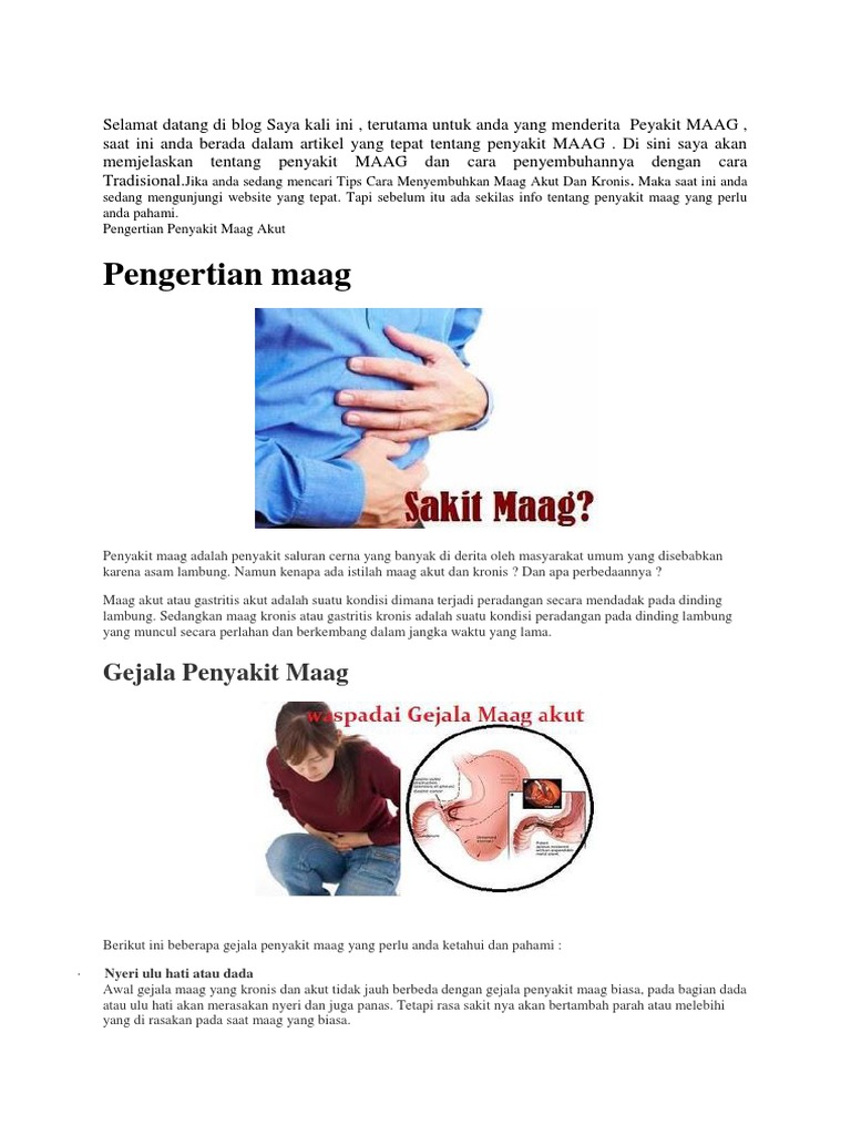 Jika anda menderita sakit maag jangan biarkan semakin parah. Penyakit maag merupakan salah satu penyakit pada saluran pencernaan yang banyak diderita masyarakat dan sering terdengar di telinga kita kata maag diikuti dengan kata kronis menjadi maag kronis dan terkadang diikuti dengan kata akut menjadi maag akut.