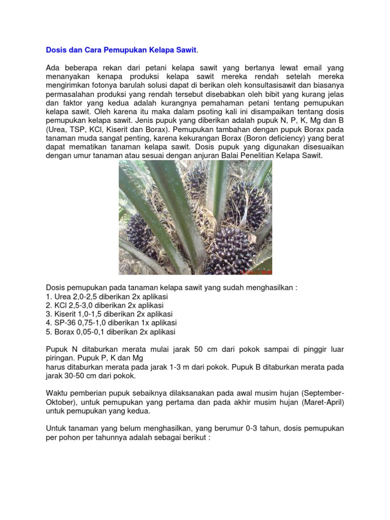 Dosis pupuk yang digunakan disesuaikan dengan anjuran balai penelitian untuk tbm tanaman belum menghasilkan. Dosis dan cara pemupukan kelapa sawit. Pemupukan tambahan dengan pupuk bora.