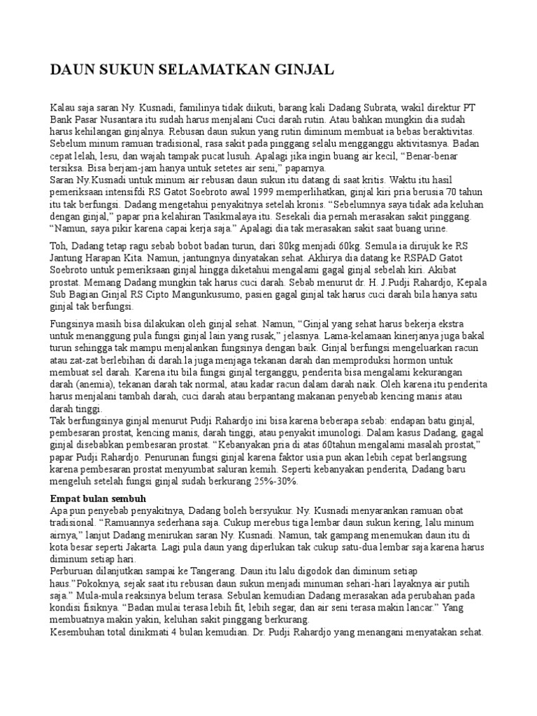 Pengalaman dadang subrata wakil direktur pt bank pasar nusantara itu sudah harus menjalani cuci darah rutin bahkan mungkin dia sudah harus kehilangan ginjalnya. Kusnadi akhirnya yang menyarankan ramuan obat tradisional. Gejala gagal ginjal dan cara mencegah.
