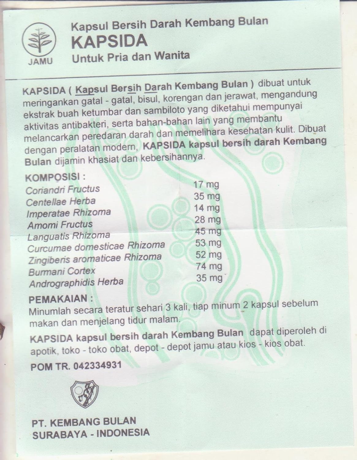 Komposisi kapsul bersih darah kembang bulan ini terdiri dari bahan alami yang dirancang secara khusus seperti ekstrak dari ketumbar dan ekstrak sambiloto yang sudah dikenal sejak jaman nenak moyang memiliki manfaat atau sifat antibakteri sehingga dapat membersihkan kulit dari jerawat akibat kuman dan bakteri. Kembang bulan adalah salah satu produsen jamu di indonesia didirikan sejak tahun 1960 an dan masih aktif berproduksi sampai sekarang. Kegunaan kapsida kapsul bersih darah kembang bulan adalah obat untuk mengobati gatal gatal bisul obat jerawat dan korengan.