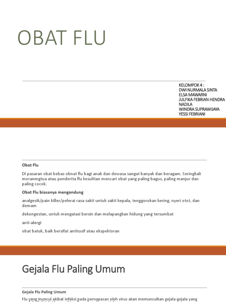 Terlepas dari itu semua sebenarnya ada banyak jenis obat flu yang bisa disesuiakan dengan kebutuhan masing masing. Obat flu hanya akan menyebabkan kantuk kalau ia berisi golongan antihistamin misalnya ctm dan kawan kawan. Sesuai dengan keluhan dan gejalanya obat flu yang beredar di masyarakat baik tunggal maupun kombinasi memiliki khasiat sbb.