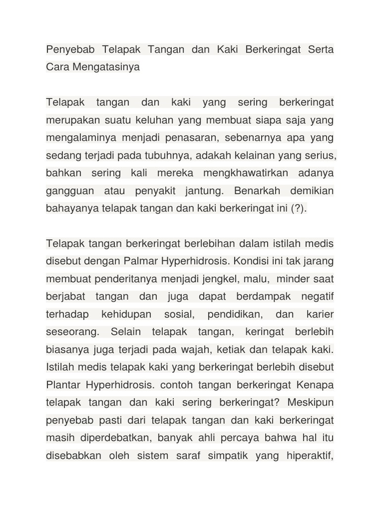 Salah satunya adalah keluarnya keringat dari telapak tangan dan kaki. Suhu badan diatur oleh bagian otak yang dinamakan hipotalamus selain itu kulit ikut. Anda berkeringat hanya di beberapa area tubuh seperti kening ketiak atau telapak tangan dan telapak kaki anda ini dikenal sebagai hiperidrosis palmoplantar.