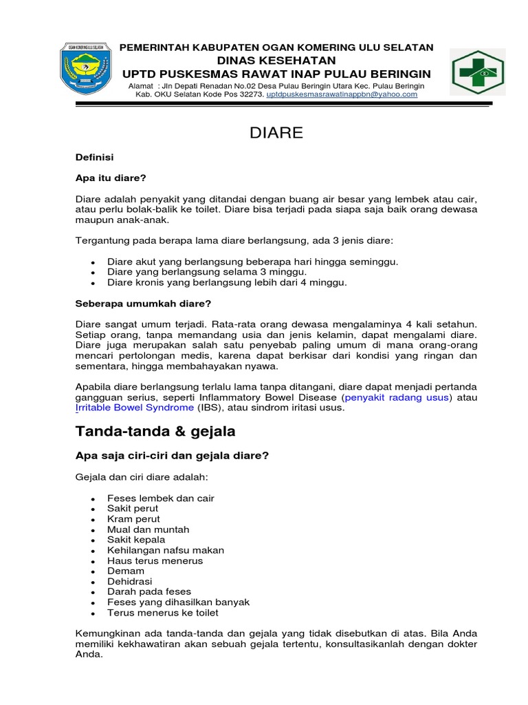 Buang air besar terus menerus atau yang akrab disebut dengan diare ini merupakan salah satu penyakit yang ditandai dengan perubahan feses menjadi lebih lembek atau cair. Cara mengobati batuk terus menerus berkepanjangan dan tak kunjung sembuh. Pada orang dewasa hendaknya sesering mungkin minum oralit ketika menderita mencret terutama setelah bab.