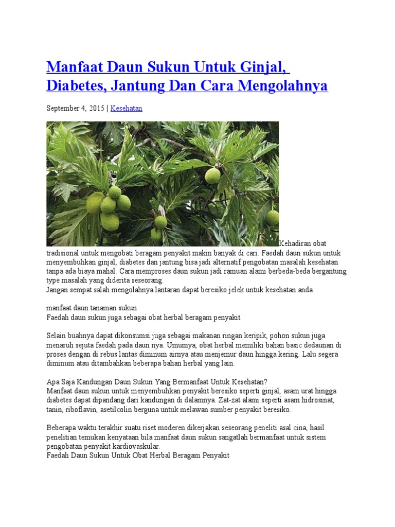 Manfaat daun sukun untuk ginjal. Untuk memanfaatkan manfaat daun sukun bagi penderita diabetes tentunya anda harus tau cara pemakaian daun sukun nya maksudnya adalah anda harus tau cara mengolah daun sukun ini. Ternyata selain buahnya daunnya pun memiliki manfaat yang luar biasa.