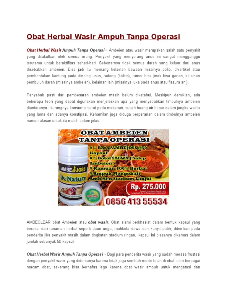 Obat herbal ambeien tanpa operasi. Obat ambeien terbaik ambeclear dari de nature adalah obat ambeien herbal yang memang terbaik untuk mengobati ambeien dan sudah terdaftar di badan obat dan makanan bpom. Obat wasir herbal stadium 4 tanpa operasi banyak perawatan yang tersedia dan umum hanya memberikan bantuan sementara dan tidak bisa memberikan obat abadi. Cara mengobati ambeien tanpa operasi.