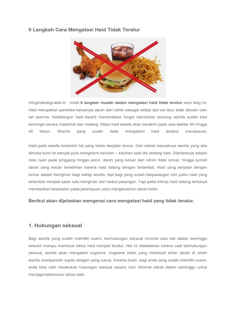 Cara mengatasi haid tidak teratur seperti yang telah kita ketahui menstruasi merupakan suatu proses meluruhnya dinding rahim yang keluar bersamaan dengan pembuluh darah kotor. Cara mengatasi menstruasi tidak teraturapasih yang menyebabkan menstruasi tidak teratur. Haid ini berlangsung 3 5 hari paling lama.