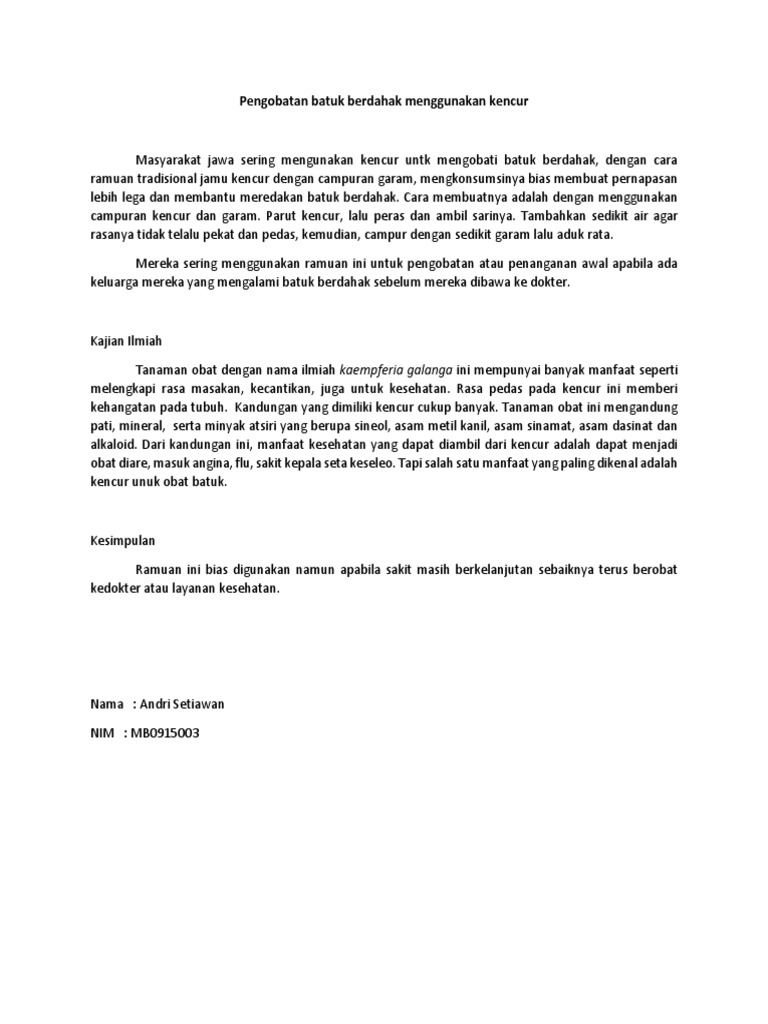 Semoga bermanfaat dan selamat mencoba. Selain sebagai bumbu masakan nyatanya kencur memiliki beragam manfaat yang baik untuk kesehatan di antaranya. Daftar obat batuk tradisional batuk adalah suatu respon alami dari sistem pertahanan pada saluran napas apabila terdapat gangguan dari luarrespon tersebut dapat berfungsi untuk membersihkan lendir atau mengeluarkan bahan iritan seperti debu asap ataupun benda asing lain untuk dikeluarkan dari paru paru.