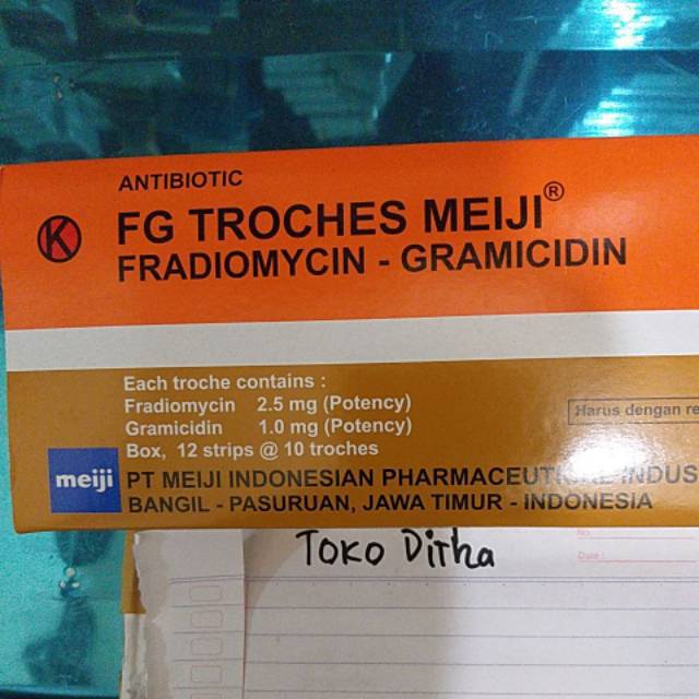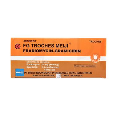 Fg troches meiji obat apa. Fg troches adalah obat untuk mengatasi berbagai jenis peradangan. Membantu mengatasi radang gusi. Kandungan obat ini adalah antibiotik fradiomisin sulfat 25 mg dan gramisidin s hcl 1 mg.