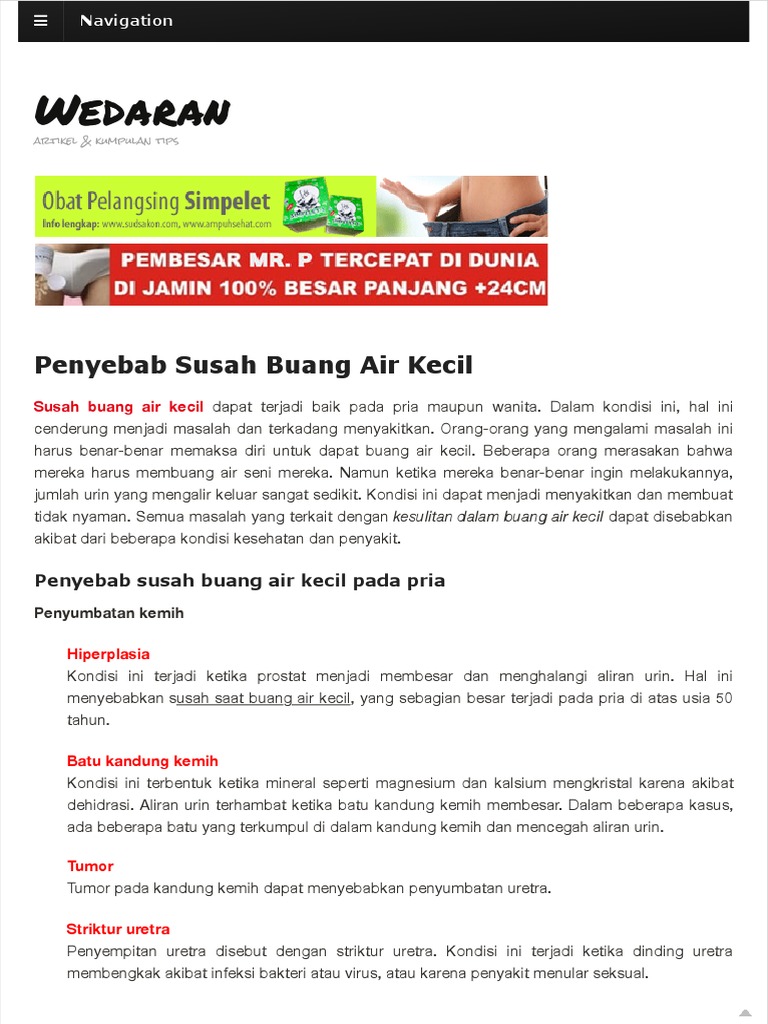 Bahaya susah buang air kecil pada anak orang dewasa dan ibu hamil. Penyebab susah buang air kecil pada pria secara umum penyebab susah buang air kecil disebabkan oleh adanya kelainan struktur atau otot yang memengaruhi fungsi kandung kemih. Sulit buang air kecil memang sangat tidak menyenangkan terlebih ketika kita beraktifitas.