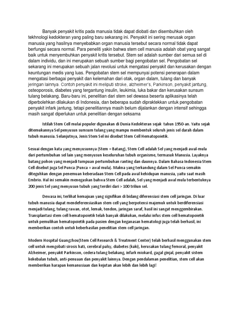 Stem cell dapat bermanfaat untuk mengurangi pemakaian obat immunosupresan pada pasien pasca transplantasi ginjal sebaiknya bila ingin mencoba stem cell sudah dilakukan sejak awal dimana fungsi ginjal masih di atas 50 dan nilai ureum serta creatinin belum tinggi. Barang siapa memberikan laporan palsu akan. Dengan menyuntikan atau mengoleskan ke bagian tubuh stem cell dipastikan dapat bekerja dengan sendirinya.