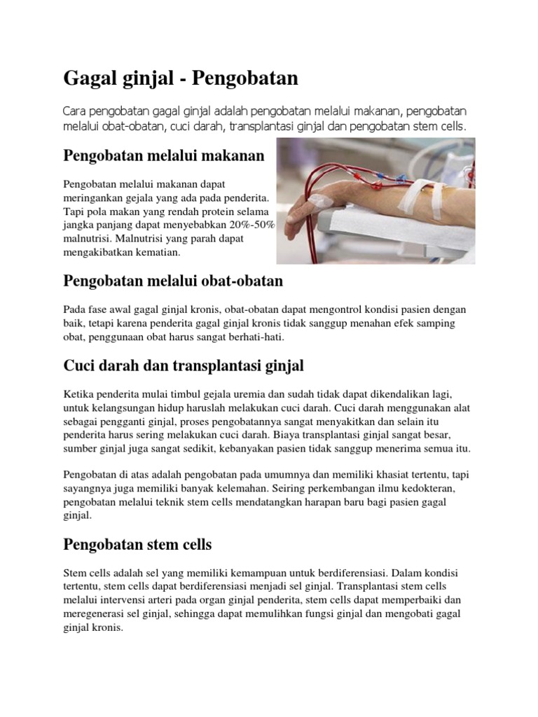 Kalo bisa berapa lama terapi untuk pengobatan gagal ginjal dan berapa besar biayanya untuk pengobatan tsb. Terapi stem cell untuk gagal ginjal hubungi. Cara pengobatan gagal ginjal adalah pengobatan melalui makanan pengobatan melalui obat obatan hemodialisis cuci darah transplantasi ginjal dan pengobatan stem cells.