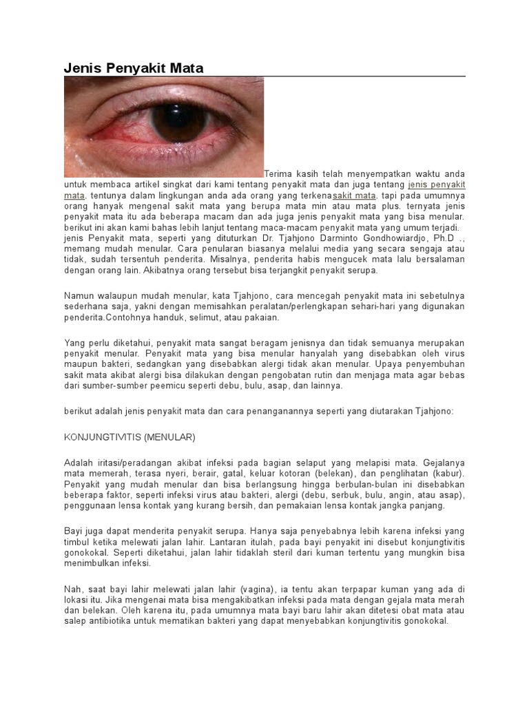 Mata merupakan salah satu panca indra kita yang sangat berharga maka dari itu kesehatan mata sangat perlu untuk di jaga agar tetap. Cara mengobati sakit mata dengan cepat. Akan tetapi sebelum mengetahui bagaimana cara mengobati sakit mata dengan cepat ada baiknya jika anda mengetahui jenis jenis serta penyebab penyakit pada mata.