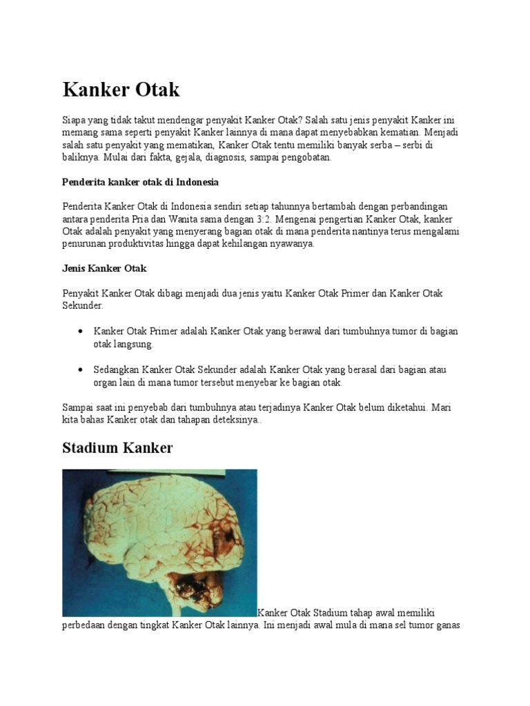 Berdasarkan ilmu medis terdapat dua jenis kanker otak pada stadium 1 yaitu kanker otak primer dan kanker otak sekunder. Tidak semua kanker mempunyai gejala awal ada juga yang membunuh. Nah itulah beberapa gejala kanker otak stadium awal sampai akhir yang paling sering dialami oleh penderitanya.