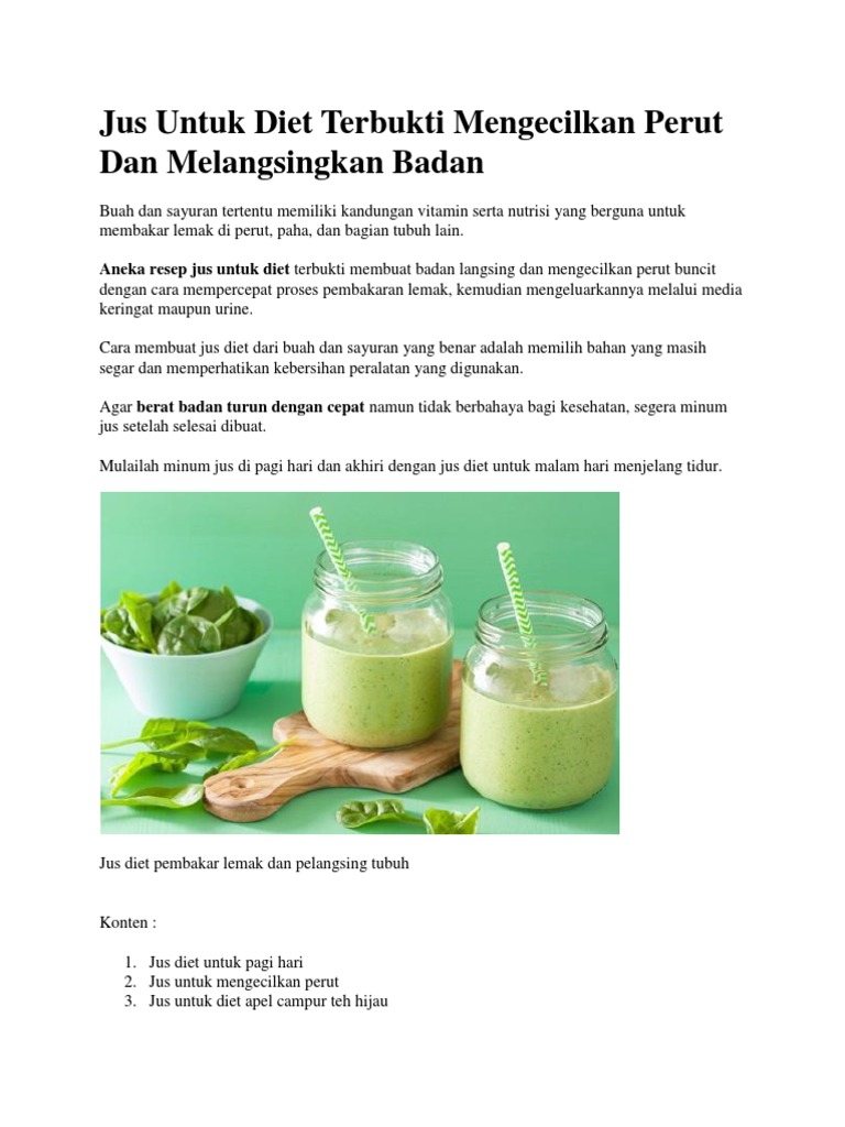 Untuk mereka yg sulit tuk menurunkan badan kadang merasakan percuma saja melangsungkan hal ini. Aneka resep jus untuk diet terbukti membuat badan langsing dan mengecilkan perut buncit dengan cara mempercepat proses pembakaran lemak kemudian mengeluarkannya melalui media keringat maupun urine.