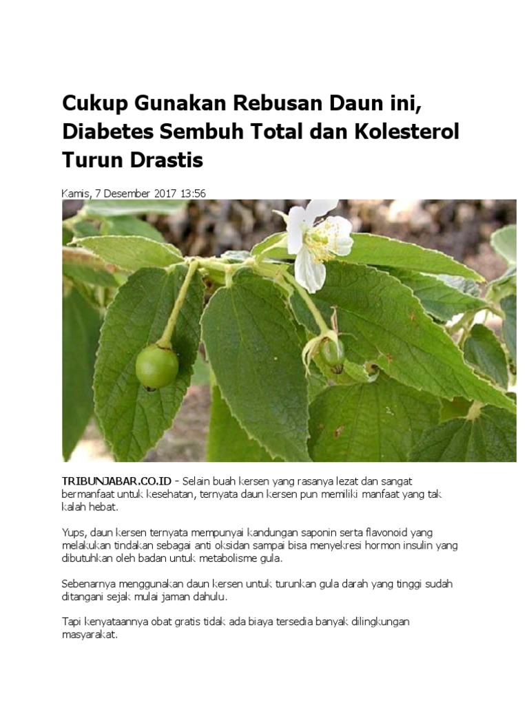 Daun kersen mempunyai banyak manfaat untuk kesehatan. Misalnya mengatasi penyakit diabetes kolesterol tinggi stroke dsb. Daun seri atau daun kersen untuk diabetes atau kolesterol sangat manjur cepat menurunkan gula darah dan kolesterol bagi penderita diabetes kolesterol diminum 1 jam sebelum atau sesudah minum.